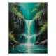 Ein atemberaubendes und lebendiges Bild eines Wasserfalls, der in einen klaren Pool mündet. Das Wasser wird in auffallenden Weiß- und leuchtenden aquamarinen Farbtönen ausgeschüttet und steht im Kontrast zu den dunklen, zerklüfteten Felsen, die die Felsen auf beiden Seiten bilden. Das üppige, grüne Grün und zarte Weinberge mit gelben Blüten hängen von den Felsvorsprüngen, die das Gefühl eines versteckten, natürlichen Heiligtums vermitteln. Das Wasser am unteren Ende der Wasserfälle ist ein reflektierendes türkis, mit Wellen und einem feinen Sprühnebel in der Luft gefangen. Der Stil ist dynamisch und ausdrucksvoll, wobei der Schwerpunkt auf der Erfassung der Bewegung und des Lichts des Wassers liegt.