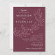 Botanische Hochzeitseinladungen mit Ihren Namen und Hochzeitsdetails in weißer Schrift geteilt durch eine Weinrebe mit skizzierten Blätter mit Merlot-Hintergrund. Die eleganten Einladungen für Hochzeiten stimmen sich mit unserer Cascading Blätter Hochzeitskollektion ab.