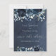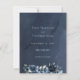 Eine blühende Hochzeitskarte in Marineblau, Save the Date mit einem marineblau gestrichenen Aquarell mit marineblau und staubblauen Pfannkuchen und Eukalyptusgrün.