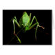 This note card feature a lively green katydid haben wir rein black background. Katydids are medium-sized to large insekts. They are usually green, sometimes with brown markings, and are camouflaged to blend with the leaves they feed on. Their very long antennae unterscheiguish them from grasshoppers. Seen up close, they seem to be aliens from outer space!