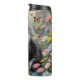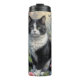 Eine Schwarz-Weiß-Katze sitzt inmitten eines blühenden Gartens mit bunten Blume, in dem sich Schmetterlinge tummeln. Die Szene ist in sanfter, warmer Beleuchtung gebadet und schafft eine märchenhafte Atmosphäre.