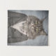 Dieses Ausrüstungsbeschreibungen, die eine Katze in einer Wolljackenstrickjacke und niedlichen in einer Strickhalskette kleidete.