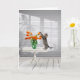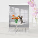 Orangefarbener Tulpenstrauß auf einem alten Holztisch und verspielter grauer Tischkatze mit Fensterschatten auf Backsteinen.