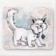 Ein flaumiges, weiß, Cartoonkatze trägt ihre Spielzeugmaus in ihrem Mund, vorbereiten für mehr Spiel! Dieser niedliche Entwurf wurde mit Watercolor und Tinte geschaffen.