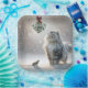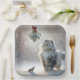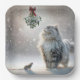 Eine flauschige Katze und eine winzige Maus blicken auf einen Haufen Mistelen, die mit einem roten Bogen geschmückt sind, während Schneeflocken sanft um sie herumfallen