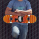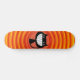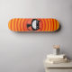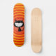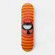 Lächelnde Katze mit funky orangefarbenem Hintergrund. Cooles Skateboard