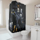 Eine glänzende schwarze Katze mit gelben Augen stehend mit einem Haufen Katzen dahinter.