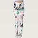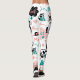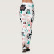 Weiße Leggings mit einem Muster aus Cartoon, Katzen, Herz, Sternen, Kakteen, Mäusen und den Begriffen "Meow" und "Cat", getragen von einer Person mit schwarz-weißen Sneakern.