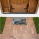 Die Worte auf dieser Türmatte sagen: "Shh! Wir nehmen Cat-Nickerchen." Diese Türmatte zeigt Schatten, unsere sehr weiche graue Katze mit langen weißen Whiskys, grünen Augen und einem hübschen Gesicht, während er sich auf ein Nickerchen im Schatten unter einem Baum vorbereitet. Diese schöne Katze fand ihren Weg zu unserer Zuhause und fasste uns das Herz.