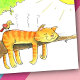Eine niedliche Orangenkatze schläft bei Sommerhitze auf einem Baumarm. Ein Vogel sitzt auf seinem Rücken und beobachtet ihn.