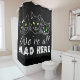 Wir sind alle Mad Hier Text und zeichnete von drei lustigen Katzengesichtern mit gelben und grünen Augen. Funny T - Shirt, Drucke und Geschenke für Spaß und gute Laune. Duschvorhang zu dekorieren Ihr Badezimmer für Spaß und gute Laune. Dunkle und schwarze Produkte.