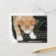 Orangefarbene und weiße Tabbierkatze macht seine Korrespondenz auf die altmodische Art, auf eine alte Schreibmaschine. Guter Text könnte sein, dass ich dich schreibe, bitte schreibe mir etc