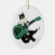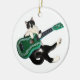Eine Schwarzweiss-Katze klimpert einen grünen Ukulele.