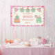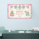 Adorable Fun Geburtstagsparty Banner mit einem niedlichen kawaii-grünen Frosch mit einer Kerze auf dem Kopf, die das Oberteil eines Geburtstagskuchens hervorhebt. Der Kuchen hat einen gelben Schwamm, roten Konfitüre und rosa Eis mit Sprinklen und sitzt auf einem lila Teller. Der Frosch ist grün und hat ein süßes Lächeln auf dem Gesicht. Ein weiterer glücklicher, grüner Frosch mit einem rosa, herzförmigen Ballon, der einen Hut aus Party trägt, und einer Fahne über dem Banner mit Fahnen und fröhlichen Froschgesichtern. Text lesen "Willkommen in Sophia's 4. Geburtstag Party" ist in der Mitte des Banners ist dies eine Vorlage können Sie leicht ändern mit dem Tool, um Ihre Banner für die perfekte Party-Nachricht. Der Hintergrund ist eine weiße Vereisung an einem rosa Rand mit bunten Punkten, die verziert werden sollen.