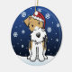 Niedliche Drahtfox-Terrier-Weihnachtsverzierung, gezeichnet in kawaii Cartoon! Diese entzückende Hundezucht trägt eine rote Weihnachtsmannmütze, und Schneeflocken fallen ganz um ihn. Absolut entzückend, perfekt für den des Hundebaum liebhabers Weihnachts!