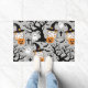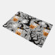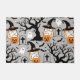 Eine hübsche kawaii-Kätzin, die als Hexe verkleidet ist und einen orangefarbenen Kürbis hält, wie sie trickst oder in einem spukhaften Friedhof behandelt, umgeben von Gespenstern und Fledermäusen.