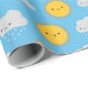 Repeat pattern of happy suns and sad rain clouds on a blue sky background for changeable springtime weather.