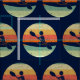 Wunderschöner Kajakstoff in Mitternachtsblau mit einem Kajakschuh, der bei Sonnenuntergang auf einem See in coolem Muster rudert. Niedliches Kayaking-Stoffgeschenk.