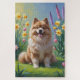 Ein fröhlicher Hund sitzt friedlich auf üppig grünem Gras, umgeben von bunten Frühlingsblüten unter einem weichen blauen Himmel. Dieses digitale Ölgemälde erfasst einen ruhigen Moment mit ausdrucksvollen Pinselstrichen, warmen Farben und einem Gefühl sanfter Freude.