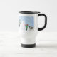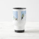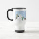 Keeshond Holiday Travel Mug. Happy winter scene with a child and grandpa building a Keesie snow dog. Cute Keeshond is enjoying the cold weather and snowfall. Visit Jenn’s Doodle World for more Keeshond art and gifts. ©Jenn Inashvili