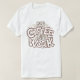 Dieser weiße T - Shirt weist ein handgezeichnet, doodle-artiges Design mit dem Text "NO COFFEE NO WORK" auf, das spielerisch angeordnet ist. Die Worte sind in Braun umrissen und von verstreuten Kaffeebohnen-Illustrationen umgeben.