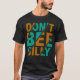 Dieser schwarze T - Shirt enthält den Satz "DON'T BEE ALBERN" in einem fett gestapelten Design, das aquamarine und orangefarbene Schriften verwendet. Diagonale Linien durchschneiden den Text und fügen der spielerischen Botschaft ein dynamisches und leicht edges Gefühl hinzu.