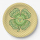 Dieser klassische vierblättriges Kleeblatt überlagert ein konzentrisches Kreisdesign mit Schichten keltischer Weben in verschiedenen grünen Farbtönen mit ein wenig Orange für Akzente.
