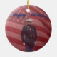 Dieses Militär Happy Holiday's Ornament lässt sich leicht mit Text für Ihre Freunde, Familie oder Lieben anpassen. Ein stolzer Soldat steht vor unserer schwingenden amerikanischen Flagge.
