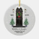 Dieses Weihnachtsgeschmuck mit einem hellgrauen, schneebedeckten Hintergrund mit einer Türenszene inklusive Weihnachtsbäumen und einem Kranz mit kariertem Gingham passt zu unserer Zuhause For the Holidays Kollektion. Dieses Keramik Sake-Ornament ist perfekt für Neuvermählte oder ein Paar, das gemeinsam in einer neuen Zuhause oder Wohnung ihr erstes Weihnachten feiert! Auf der Rückseite ist ein roter Gingham kariert.