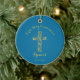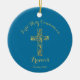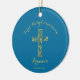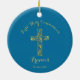 Moderne Gold-Crossjungen der First Heiligen Kommunion nennen Ornament mit blauem Hintergrund. Personalisieren Sie mit Ihrem Namen und Datum.