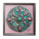 Die Keramik aus Verdigris und rosa Steinen zeichnet sich durch ein atemberaubendes Mosaik aus türkisfarbenen und rosafarbenen Steinen aus, das in einem faszinierenden Kreismuster angeordnet ist. Die Farbenvielfalt und das aufwändige Design schaffen ein visuell auffallendes Kunstwerk, das jedem Raum eine Touch der Klasse verleiht.