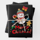 This cheerful Christmas illustration features an adorable snowman wearing a hat and scarf against a solid black background. Surrounded by bells, snowflakes, and a gingerbread man, the image highlights the bold red and green greeting "Merry Christmas!" at the bottom, making it a vibrant and sweet seasonal design.