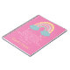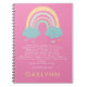 Ein reizendes Notizbuch für ein kleines Mädchen, mit der beliebten Bibelverse Philippians 4:8 in Weiß, und pastellfarbene Abbildung von Regenbogen mit Wolken und Herzen, in Senfgelb, aquamarin und lila, auf einem rosa Hintergrund. Personalisieren Sie mit dem Namen des Kindes in Senf gelb.