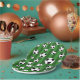 This fun kids sports equipment pattern has soccer balls on a green field striped background. The athletic gear design makes a cute addition to a birthday, Christmas, or other holiday party, especially for soccer-loving boys and girls.