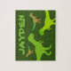 Kid's T-rex Dinosaurier-Puzzle mit individuelle Name. Prähistorische wilde Tierdarstellung mit personalisiertem Text. Spaß Geburtstag oder Weihnachten Geschenk Idee für Jungs und Mädchen in Dinos. Grüne Terranosaurus Rex Silhouetten mit fett formatierten Typografievorlagen. Wählen Sie aus kleinen oder großen Stücken, mit denen Sie spielen können. Niedliches Kinderspielzeug.