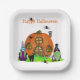 Zu Halloween-Teller für ein Halloween-Party mit einem großen Kürbis-Gnome-Zuhause und zwei Gnomen stehend auf beiden Seiten. Es gibt auch eine schwarze Katze und schwarze Spinnen. Es sagt "Happy Halloween" oben. Dieses Design ist auch in einer kompletten Party-Lieferkollektion enthalten, also schauen Sie sich die lustigen Artikel an.