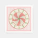 Diese Papierservietten sind mit einem originalen Design-Start mit einem rosa-weißen Hintergrund versehen, in dem ein schwebender Kranz von zückenden Weihnachtsbäumen um ein zentrales Medaillon einer klassischen Pfefferminzbonbons im Pinradstil herum liegt. Das Retro-Ambiente der Jahre 1940-1950 beruht auf verblassten Rot- und Grün- und 'Grautönen'-Effekten.