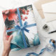Papier mit einem hübschen Weihnachtskranz umhüllen. Ein festliches Bild mit einem Kiefernkranz mit roten Blume, Heiligenschein und einem schönen blauen Bogen. Schön.