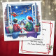Personalisierte Weihnachtskarte mit einer Illustration des Weihnachtsmannes, der mit seinem Rentier durch den Himmel fliegt und am Weihnachtsabend mit seinem Schlitten, während die Kinder durch ihr Schlafzimmerfenster schauen.