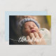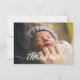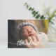 Personalisierte Babyankündigungskarte mit elegantem und modernem Script-Weiß "dankbar" Text. Ersetzen Sie das Foto, die blaue Hintergrundfarbe und die Details, um sie für Ihre spezielle Kindergeburtsvorstellung anzupassen.