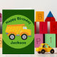 Ein cooler gelber Müllwagen auf einer niedlichen, maßgeschneiderten Green Card für einen kleinen Jungen, der Baufahrzeuge und Autos mag. Personalisieren Sie diese Grußkarte zum Geburtstag mit Ihrem Kleinkind- oder Kindernamen.