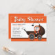 Die Einladungen der Halloween-Kinderdusche in Orange, Braun und Schwarz sind mit einer spukigen und niedlichen Babywagen und einem glücklichen, an der Seite hängenden Baby mit einem Lollipop-Spieler ausgestattet.