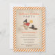 Kindergeburtsfeierlichkeiten zu Halloween, von red_dress, mit den Worten, in orange und braun, "Halloween Geburtstagsparty", eine Vintage Illustration von niedlicher Hexe auf dem Bauch, mit kleiner schwarzer Katze, und Vollmond-Gesichtsmüll. Das kleine Mädchen, getarnt als Hexe auf dem Besen, trägt einen schwarzen Hexenhut, ein rotes Kap, ein cremefarbenes Kleid mit hellblauen Punkten, niedlichen schwarzen Schuhen und gestreiften Socken (beige und weich blau).