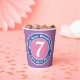 Erinnern Sie sich an einen 7. Geburtstag mit einer Papiertasse, die mit dem Namen des Empfängers, seinem Alter und seinem Geburtsdatum geschmückt ist.