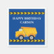 Coole kundenspezifische Konstruktion Müllwagen Geburtstagsparty Papierserviette zum Feiern eines Kindes, das gelbe Baufahrzeuge Lieben. Das Party ist gelb und blau für einen kleinen Jungen, der Pkw und Lkw Liebe. Passen Sie den Namen Ihres Kindes unter dem schwarz-gelben Warnband an.