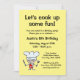 Kinder kochen Geburtstagsfeier Einladung Vorlage. Individuelle Einladungen für Kinder. Personalisieren Sie Ankündigungstext, Altersnummer und Hintergrundfarbe. Spaß zeichnend von Koch kochen Cartoon halten Gabel und Messer.