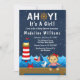 Diese niedliche und unterhaltsame Einladung beinhaltet einen Seemänner auf einem Holzdeck mit Seemannsrudel und Krabbe. Im Hintergrund befindet sich ein roter und weißer Leuchtturm, ein niedlicher Vogel auf einem Segelboot, Meereswellen und ein marineblauer Sternenhimmel. Der Text verbindet fett- und serifenlose Schriftart für ein stilvolles und modernes Aussehen. Das ist ideal für eine Babydusche zum Thema Wassersport.