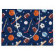 Dieses Spielsportausstattungsmuster mit Fußbällen, Fußbällen, Baseballs, Volleyballs, Hockeyschlägern und Pucks und Baseballschlägern. Die Sportausrüstung hat einen dunkelblauen Hintergrund. Es ist eine großartige Ergänzung zu einem kleinen Jungen oder Mädchen Party oder Feiern. Es ist auch eine niedliche Ergänzung zu einem Geburtstag, Weihnachten oder anderen Feiertagen.