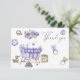 Die Einladung zeigt Aquarell, Babywickel, Kinderzimmer in Form lila Rundwolken, Kinderspielzeug: Nageelefant, Räderente, Teddybär, Hase, Bib, Schnuller, Pyramide.