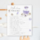 Die Einladung zeigt Aquarell, Babywickel, Kinderzimmer in Form lila Rundwolken, Kinderspielzeug: Nageelefant, Räderente, Teddybär, Hase, Bib, Schnuller, Pyramide.
